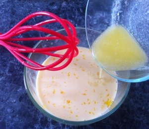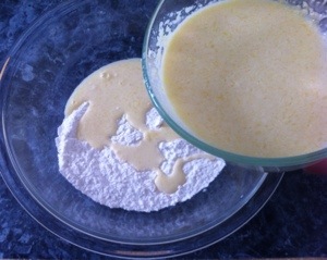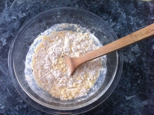 5. Add the yolk mixture to the flour mixture and stir until well blended using a wooden spoon.