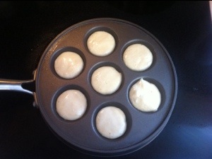 9. At this point if you are making filled Ebelskivers you would add the filling to the center of the batter in each well and then enclose it by adding a little more batter on top. Sometimes I use jam or an apple filling similar to the inside of an apple pie