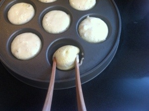 Flipping them takes a little practice, especially since the batter on the top will still be a little runny. It helps to position the two skewers on opposite sides of the Ebelskiver. Slide the tips of the skewers between the edge of the Ebelskiver and the sides of the well. Push down gently with one skewer and use the other to help pull the Ebelskiver up and over.