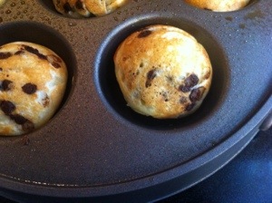The “chocolate chip” recipe is the “basic batter” with 6 ounces of miniature semisweet chocolate chips added to the batter. However, I decided to just make one batch of the “vanilla batter” and add chocolate chips to the batter after I’d used half of it since each batch makes about 21 Ebelskivers or 4 servings.