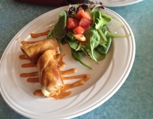 Accompanied by some mixed greens, the Philly Cheesesteak Springroll is served with a homemade cheese sauce and chipolte mayo which pairs perfectly with the spring rolls.
