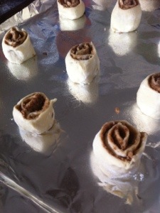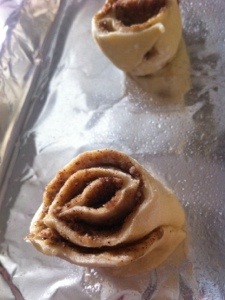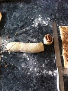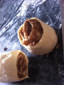 6. When the dough and cinnamon mixture is rolled up, cut into 2 inch slices.