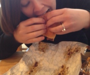 For now, here’s a sneak peak of my face (well, part of it, I can’t give it all away at once) and the sandwich I’m shoving into it!