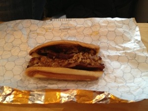 My personal favorite since I was a kid has always been the hotdog so I absolutely built my own hotdog: grassfed beef, thick cut bacon, onion crunch, and cheese sauce.