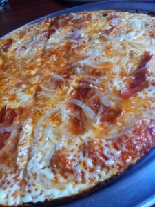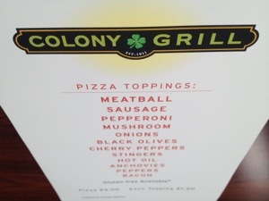 Our other pizza was a bacon onion, my favorite combo to order at Colony Grill. Now, I’m a pizza crust person all the way, but there is something about how very thin and light Colony’s pizza is that you must give it a try. The pizza is light, cheesy, a little greasy (the amount of greasy you want in your pizza), and entirely foldable for all you slice folders out there. And, for all my gluten-free friends, I’m excited to say that Colony offers gluten free pizza!