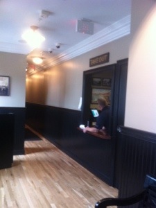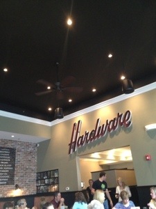 The old Harrison Hardware sign is a very thoughtful way to acknowledge the history of both the building and the town of Milford, and my favorite part of the decor.