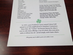 And, for all the history buffs out there, did you know Colony Grill, Stamford opened its doors not long after the end of Prohibition? This little history tidbit is printed on the back of all the menus.