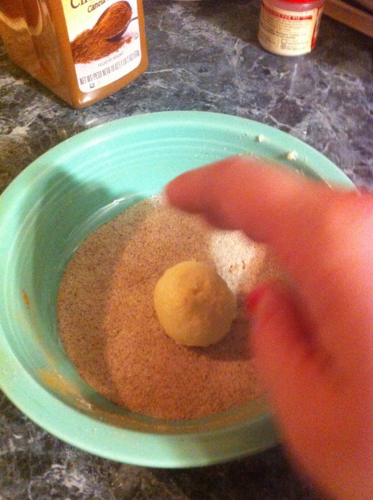 6. Roll dough into 1 inch balls (you can make them larger, 1 1/2 – 2 inches but then you must adjust baking time accordingly), and roll in the cinnamon sugar mixture.