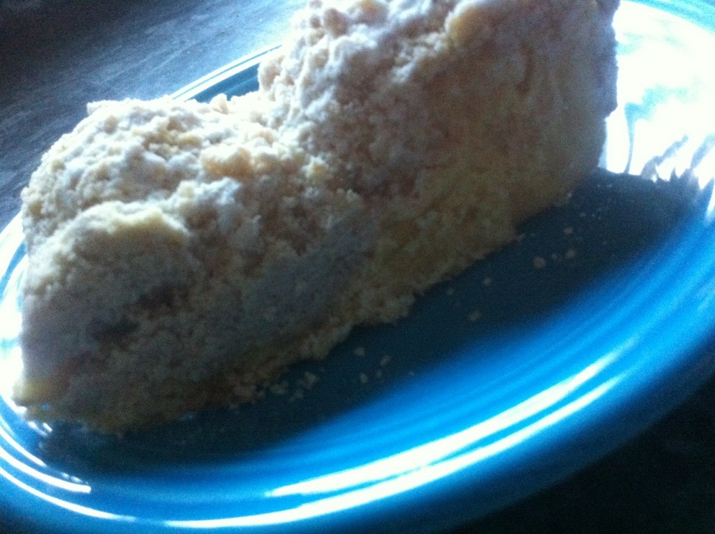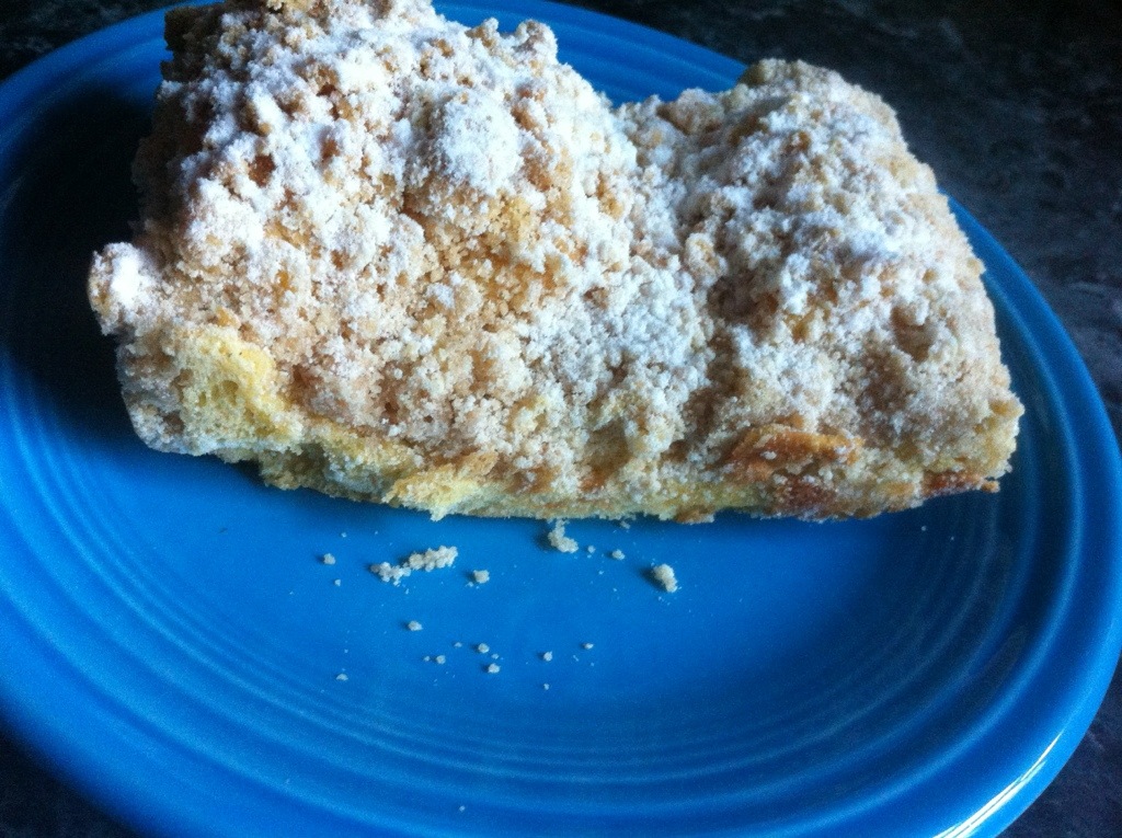 And while each piece has a rather thick layer of crumb topping around the edge, the crumb cake is a nice balance of the topping with the cake itself. As you can see, the piece of cake dips down a little in the center showing how the cake is simultaneously light with places of the thick crumb-y topping.