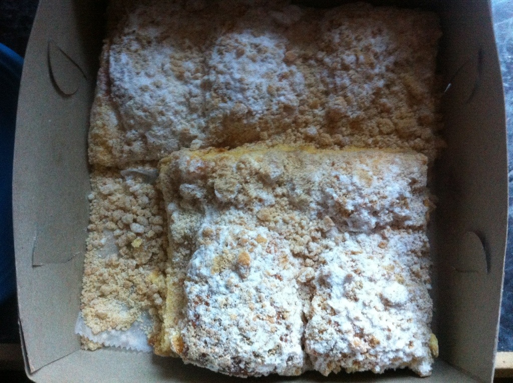 A few times each month, actually it was more like once each week, my grandfather would get up early and bring home these crumb cakes from the bakery. One of my favorite surprises is waking up to the smell of coffee brewing and seeing the unmarked white cardboard bakery box in the kitchen. The box and the anticipated bakery treats were always from Nice n’ Fresh because they were (and still are) one of our favorite local bakeries. Unopened bakery boxes will always be as exciting to me as unopened presents on Christmas morning.