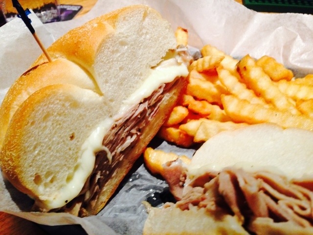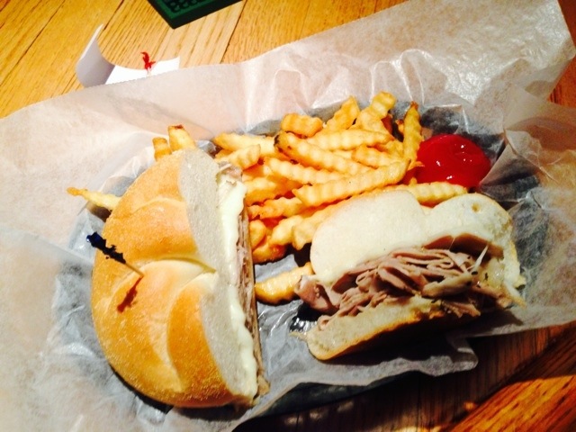 Porky’s Housemade Porchetta is made of a slow cooked porchetta (Italian pork roast), which is seasoned with garlic, salt, pepper, and fennel. The porchetta is sliced thin like deli meat, piled on a hard roll, and topped with hot peppers and mozzarella cheese and served with a side of fries and a pickle. The sandwich pictured above is without hot peppers.
