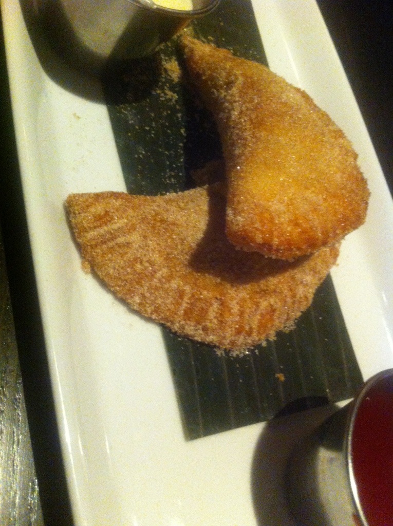 The golden brown fried dough of these sweet empanadas are filled with an apple filling reminiscent of apple pie and sprinkled with cinnamon sugar. The empanadas are a little doughy in a way that reminds me of a fried pocket pie. The cream cheese and red hot cinnamon dips served with the apple empanadas are a fun way to accentuate the apple pie flavors in this dessert.