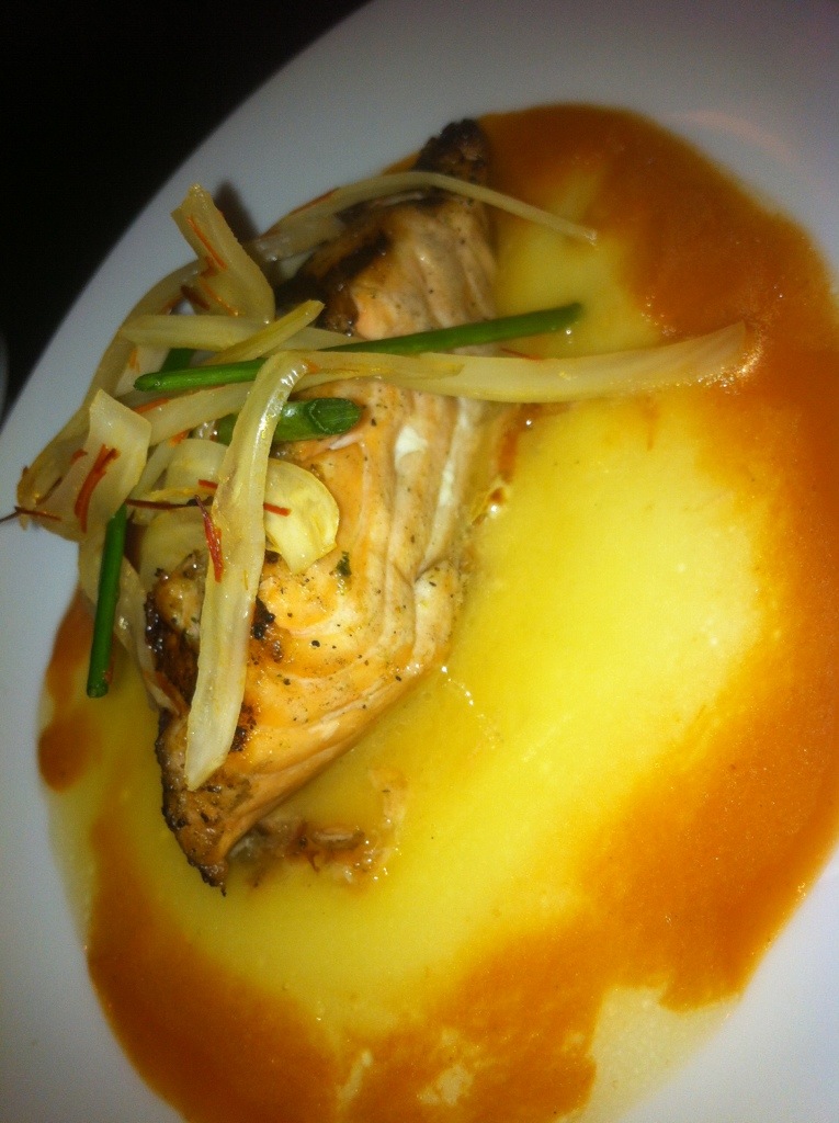 Topped with pickled fennel and plated on smoked tomato coulis and maple lime butter, the salmon dish unites a melody of flavors in such a way that all the ingredients are equally noticeable. I especially like the maple lime butter for its added sweetness and for the unexpected way the flavor of the maple syrup goes so well with the salmon.