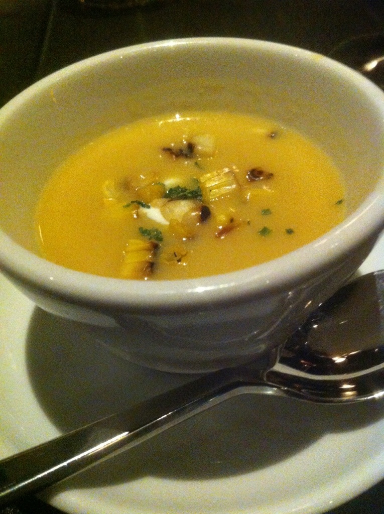 Grilled corn, chives, and a garnish of creme fraiche are the only ingredients in the Corn Bisque. The flavor of the corn and its natural sweetness is the star of the show in this dish.