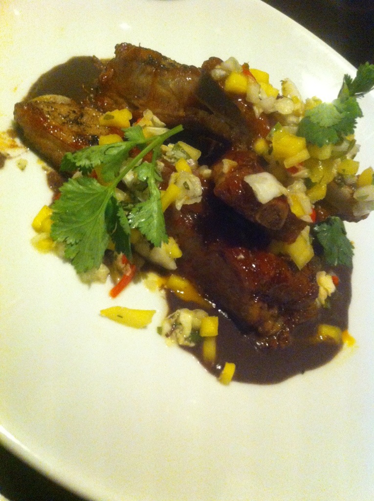 A Chile BBQ sauce, liquid black beans, and a mango slaw accompany these tender ribs. The Latin influence in this dish of the mango, black beans, and chile creates a unique BBQ rib experience.