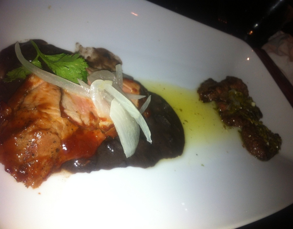 The pork tenderloin is served on a black bean stew and topped with onion mojo and cilantro.