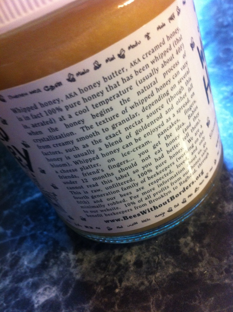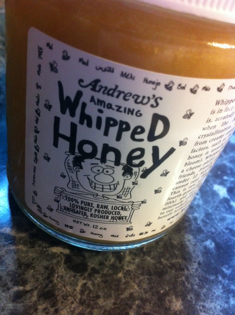 As the jar’s label explains, whipped honey is 100% honey and is also called honey butter or creamed honey. The raw, unfiltered, local, kosher, pure honey is whipped or aerated at a cool temperature (40F) and the honey crystallizes, creating a variation of texture “from creamy smooth to granular, depending on several favors such as the exact nectar source.”