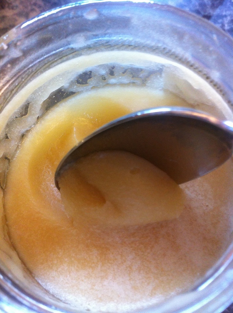 With just a little stirring the whipped honey almost has the consistency of a very soft butter, yet slightly gooey.