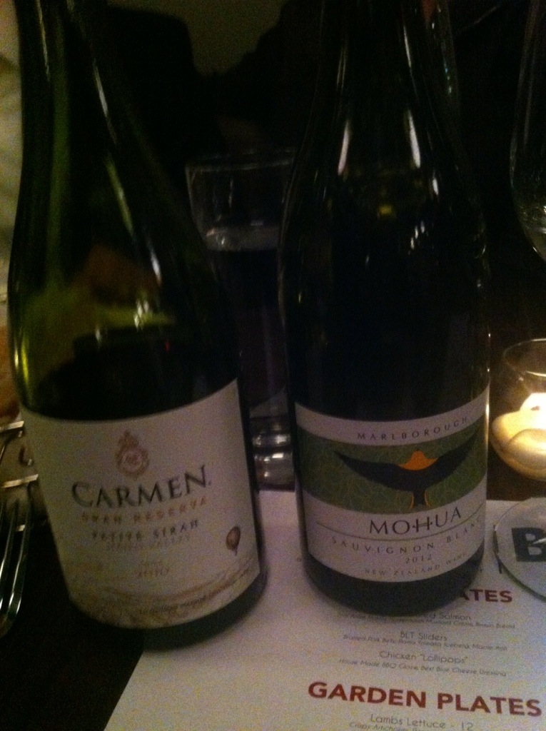 The two wines we drank while dining on the garden and large plates were a red wine from Chile, Carmen Gran Reserve, and a white wine from New Zealand, Mohua Sauvignon Blanc.