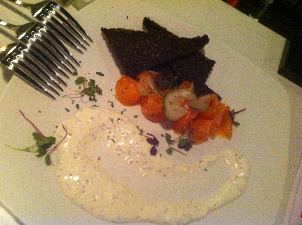 Star anise pickles, horseradish mustard creme, and brown bread make up the House Cured Salmon dish from the Small Plates menu. What I liked about this dish was both the balance of flavors between all the ingredients and how fresh all the ingredients were. The horseradish was not too strong, which I also appreciated.
