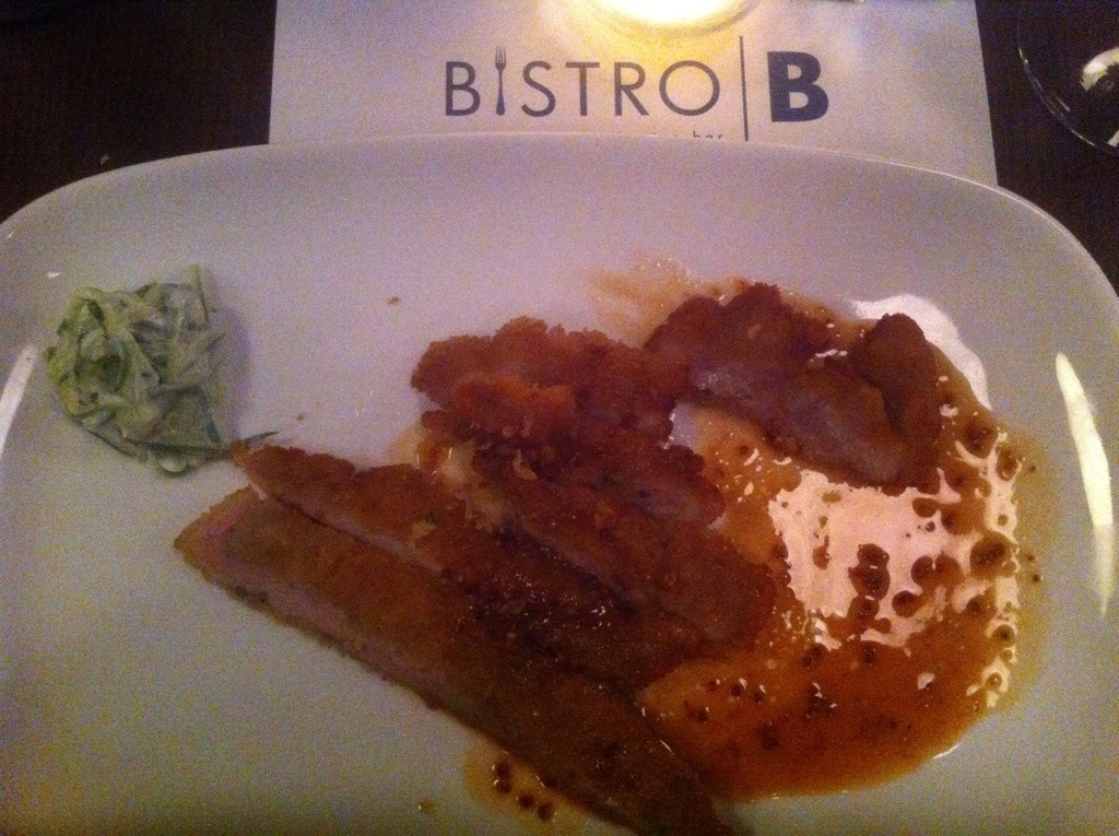 This was my first experience trying pork schnitzel and I don’t know what took me so long – it’s delicious! The pork schnitzel is tender and juicy on the inside and slightly crunchy on the outside due to the light crust. A mustard honey jus was drizzled over the top and a cucumber salad accompanied the dish.