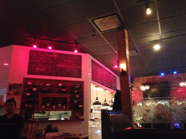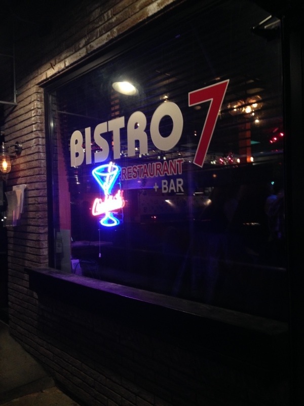 The inside of Bistro 7 is cozy and comfortable, yet it has an edgy vibe with brick exposed walls, low lighting, and black and white movies playing on the wall (we watched Charlie Chaplin for part of the evening). The waitstaff is extremely friendly and knowledgeable of the menu and wine list, which always makes one’s dining experience enjoyable and memorable.