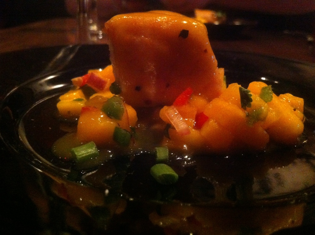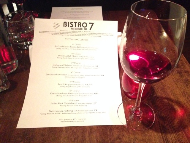 When I took a bite of the Scallop and Shrimp Ceviche at Bistro 7 I immediately wanted to be in a warm climate, possibly poolside. The freshest ingredients are used in this dish and the unmistakeable flavors of the red onion, lime juice, and cilantro create a wonderful trio of flavors which compliments the shrimp and scallops. This course was paired with a Sauvignon Blanc, 900 Grapes from New Zealand (2012).