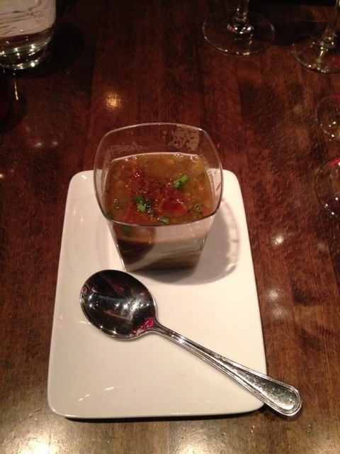The first time I met Chef Tony was a at Chowdafest 2014 where we were able to sample his Butternut Squash soup. While I have been talking about the Butternut Squash soup constantly I was very excited to try another soup on Bistro 7’s menu. The Lentil Soup is garnished with bacon, and let me tell you, they had me at “garnished with bacon”! Shouldn’t everything be garnished with bacon? The Lentil Soup is hearty, but not too filling, a perfect soup for a cold day. Did I also mention that it is both vegetarian and gluten-free?! The Lentil Soup was paired with a Rioja Crianza, Ijalba from Spain (2008).