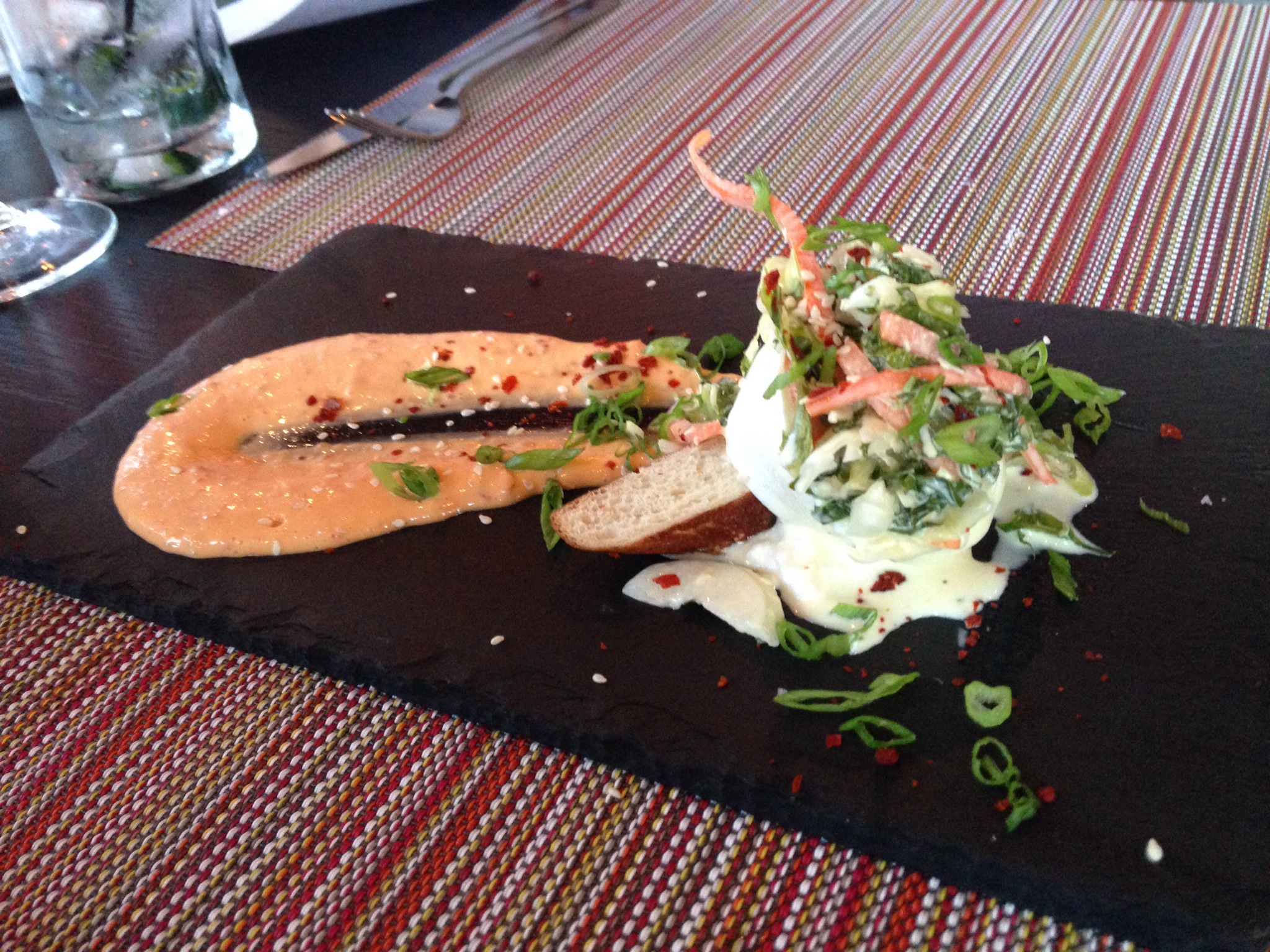 I’m a newcomer to burrata cheese and I have no idea what took me to long! Burrata is an Italian cheese made with mozzarella and cream so it is very soft and creamy. The Burrata appetizer is a combination of burrata cheese, creamy slaw, sambal aioli, and sesame on top of a pretzel bread. The soft burrata spreads on the bread, and the bread helps to soak up the creaminess of the cheese and the creamy slaw – delicious!