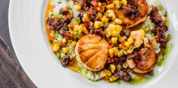 The Grouper and the Scallops further demonstrated how Washington Prime’s menu puts their own unique twist on items you might typically see on menus elsewhere. The Grouper (pictured above) is presented over Carolina gold rice along with tomato, asparagus, and a carrot butter sauce, while the Scallops (pictured below) are plated with middlins, corn relish, nicoise olives, and hunters sauce. An added feature that’s sure to please is that both dishes are gluten-free.