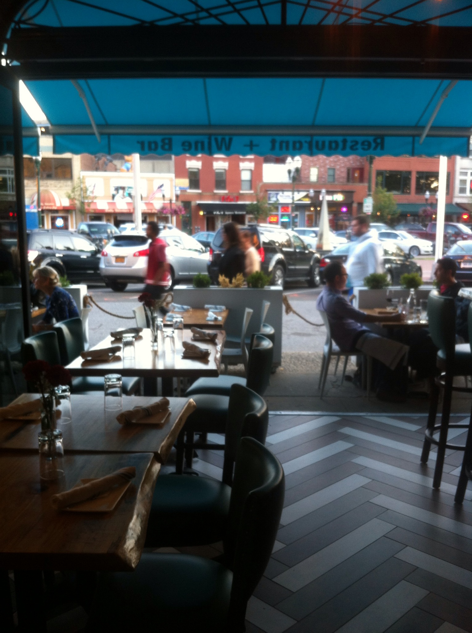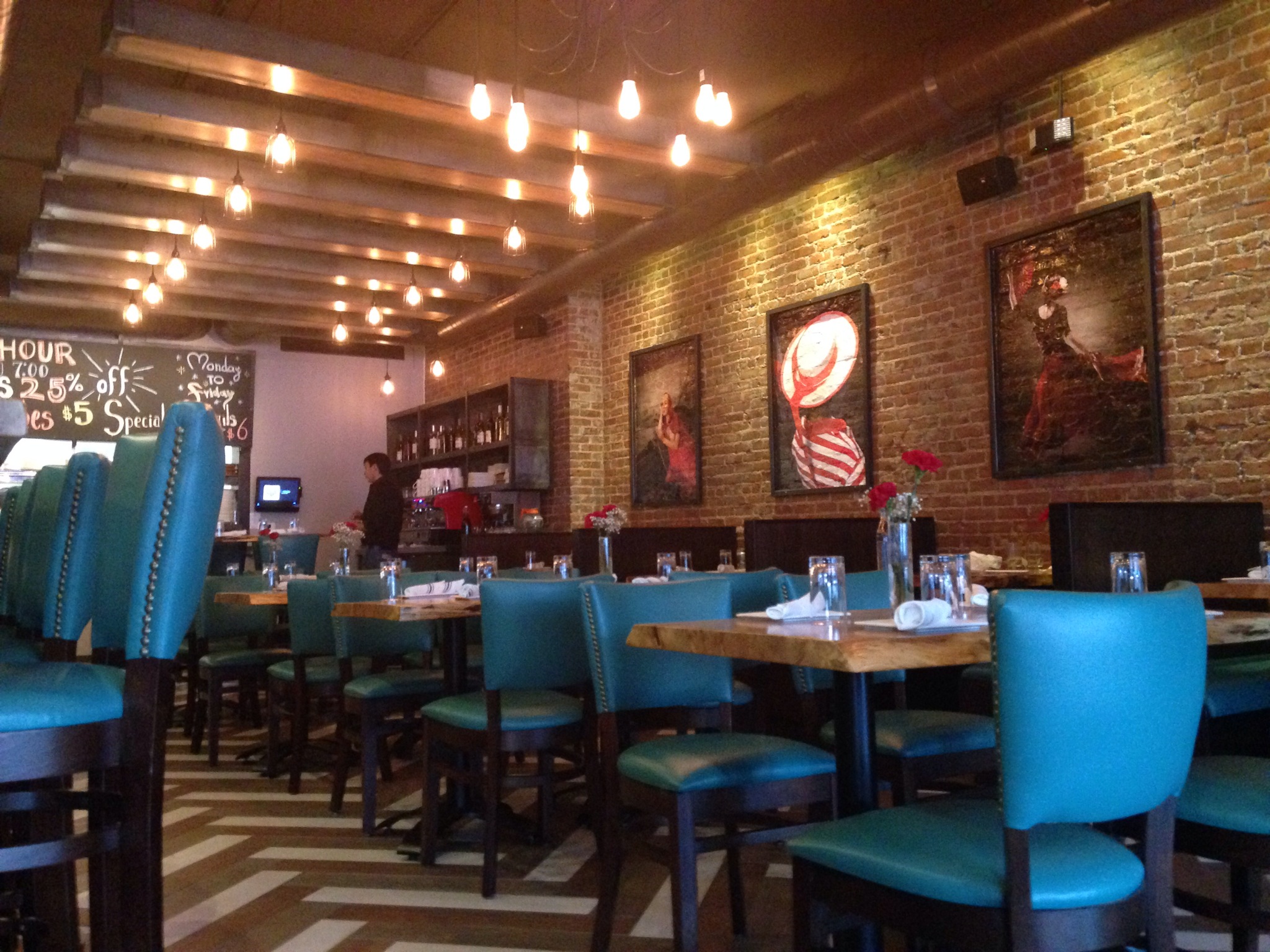 A pop of bright teal blue begins with the awning and sign and carries throughout the restaurant itself with beautiful blue leather upholstered chairs. Exposed brick, the dark wood of the long bar, and hand painted murals help to create an atmosphere that is comfortable yet full of energy in a space which seats about 80 people.