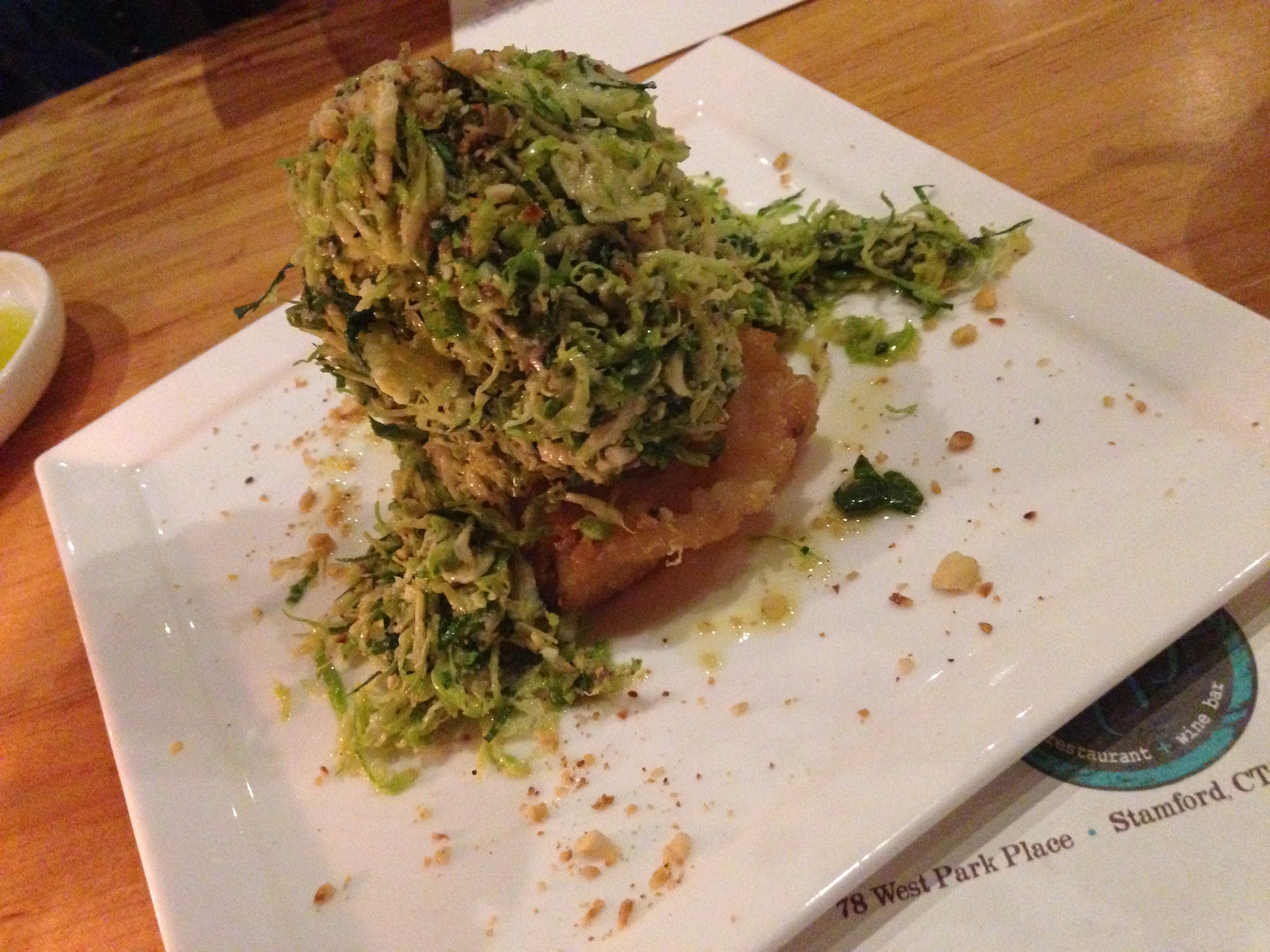 Shaved brussels sprouts, truffle oil, and lemon juice presented on top of a crispy and delicious risotto cake make for a very different kind of salad. The shaved brussels sprouts are very light and somewhat crunchy, as you would expect with a salad, and the truffle oil creates a slight nutty flavor. You could think of this salad as brussels sprouts deconstructed essentially, and if you like brussels sprouts and are looking for a unique way to eat them then this dish is for you.