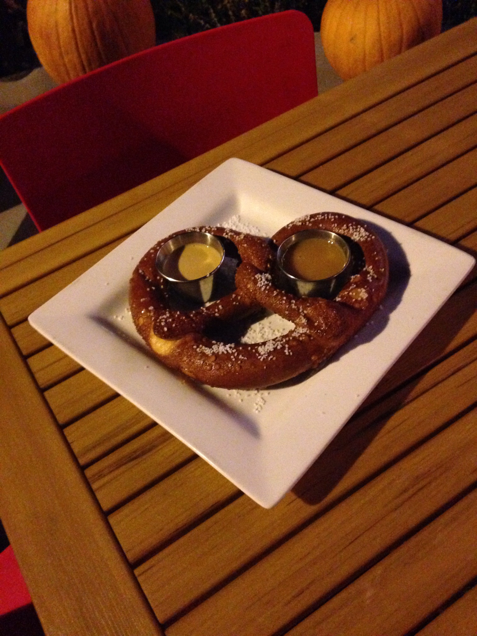 We snacked on the Giant Pretzel with our cocktails and it is exactly how it is described – GIANT. It is easily an appetizer to be shared even if you are really hungry. Served with a spicy stout and honey mustard dipping sauces the pretzel stands out because it is deep fried, but not greasy, creating a texture similar to fried dough on the outside that is slightly crispy and soft and chewy on the inside as you’d expect with a pretzel. I liked both dipping sauces, however the spicy stout was my favorite.