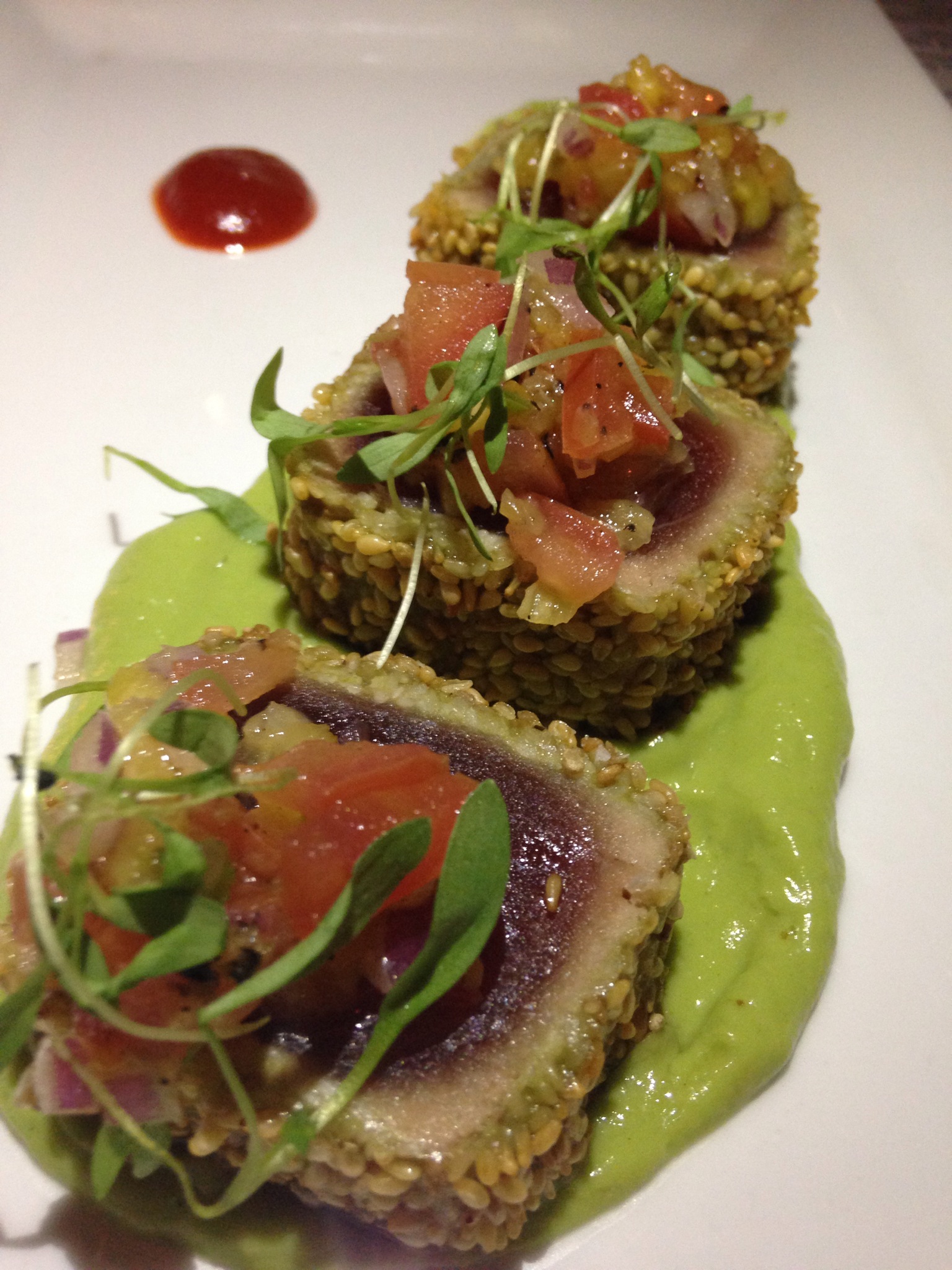The Tuna Blocks were a hit with our entire group and had people oo-ing and ah-ing. Pan seared sesame crusted Ahi Tuna over smooth roasted jalapeno-avocado puree, topped with grilled pineapple pico de gallo and a little siracha on the side creates this flavorful appetizer.