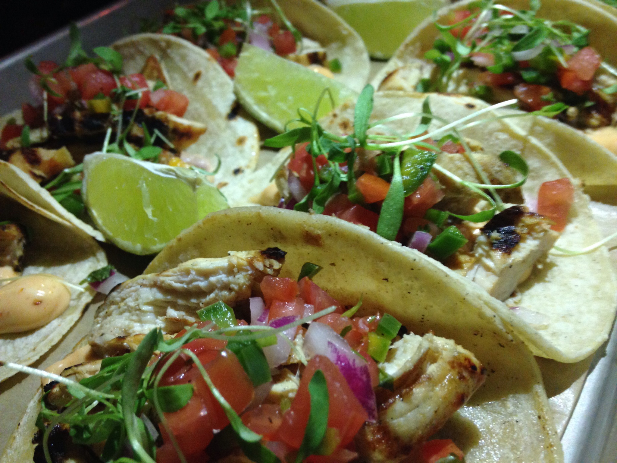 The chicken tacos are made with marinated grilled chicken, pico de gallo, micro cilantro, and a chipotle mayo to give it a little kick.
