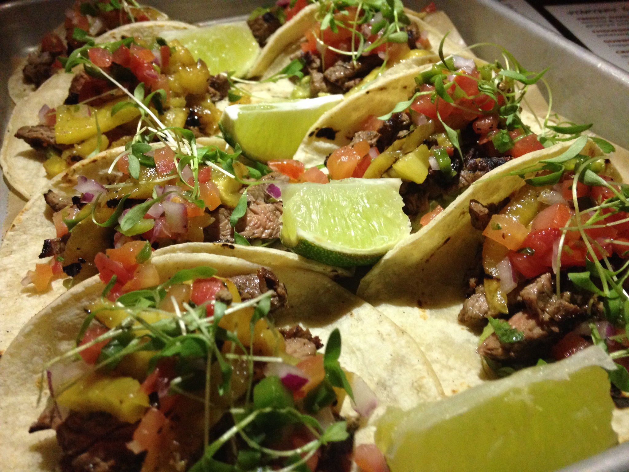 The beef tacos are made of char grilled filet tips, roasted pineapple, guacamole, pico de gallo and micro cilantro.