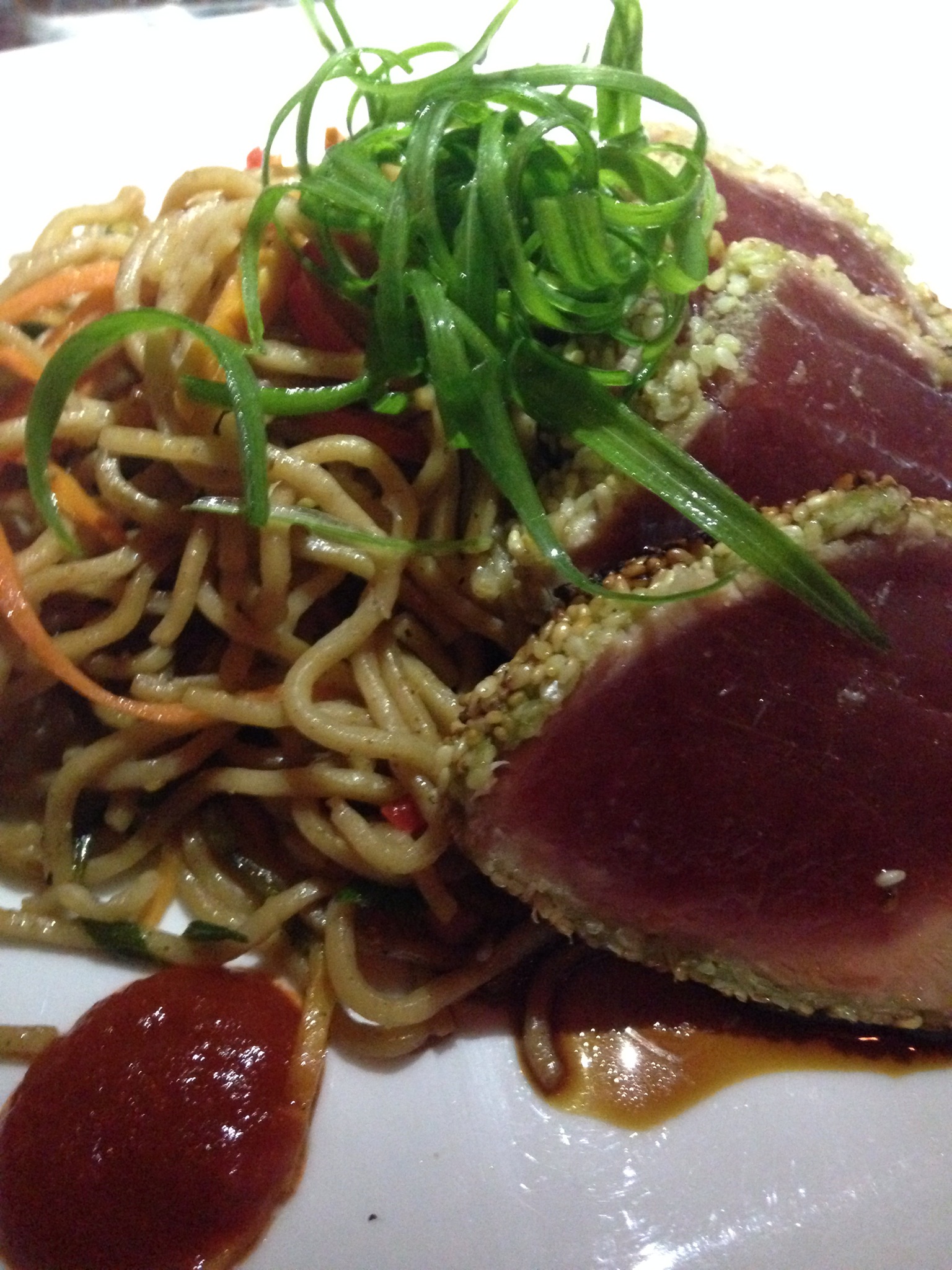 The Ahi tuna made with sesame and wasabi crusted Ahi over a warm soba noodle salad with sweet soy, scallions, and a little sriracha is very good. The crust of the sesame and wasabi create in interesting texture and the flavors, along with the sweet soy over the noodles and the sriracha, make this dish a success.