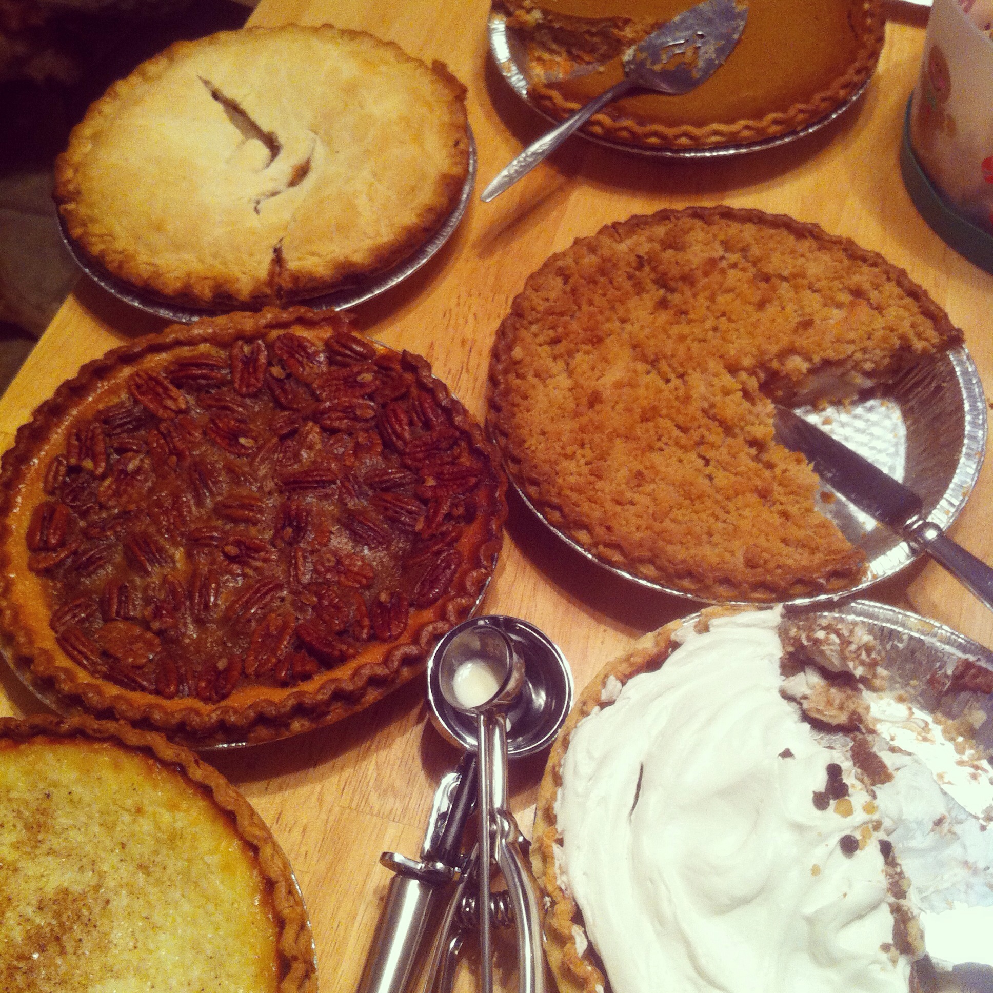 Well, my auntie went to my favorite place in Connecticut to get pie, Oronoque Farms (formerly located in Stratford and now in Shelton). As we put out the pies – Apple crumb, pumpkin, pecan, sugar free apple, coconut custard, and chocolate banana creme pie, quite the show stealer – the family hovered and then dove in. It was really quiet for a few minutes as we all enjoyed some little slices of heaven.
