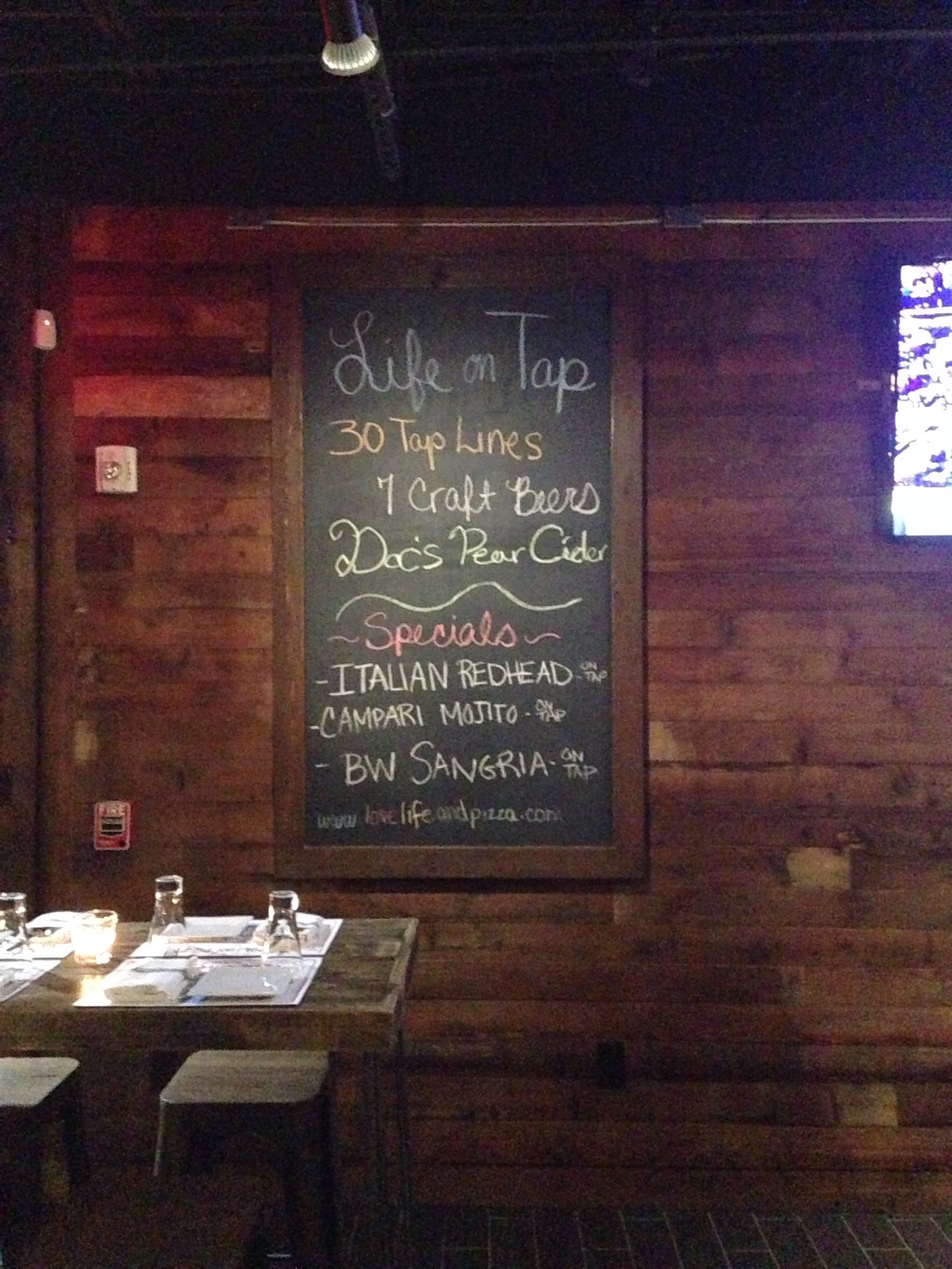 Before we tried the pizza we started off in the bar area so we could experience a little of happy hour. The bar side of Brick + Wood offers a few high top tables if you don’t prefer to sit at the bar to enjoy a cocktail ($8-12) or glass of wine-on-tap and some starters or “Neapolitan street food”.