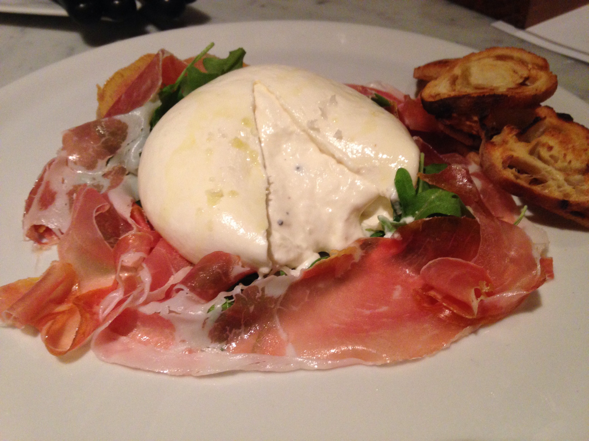 When I dream of cheese (I know I’m not the only one who does!) this Truffle Burrata is now something that pops into my brain. Fresh mozzarella with a cream and truffle filled center comprises the burrata which is further complimented by the slight saltiness of the prosciutto and the texture and flavor of the arugula. Add the crunchy crostini as a base to build upon and this appetizer is rather perfect.