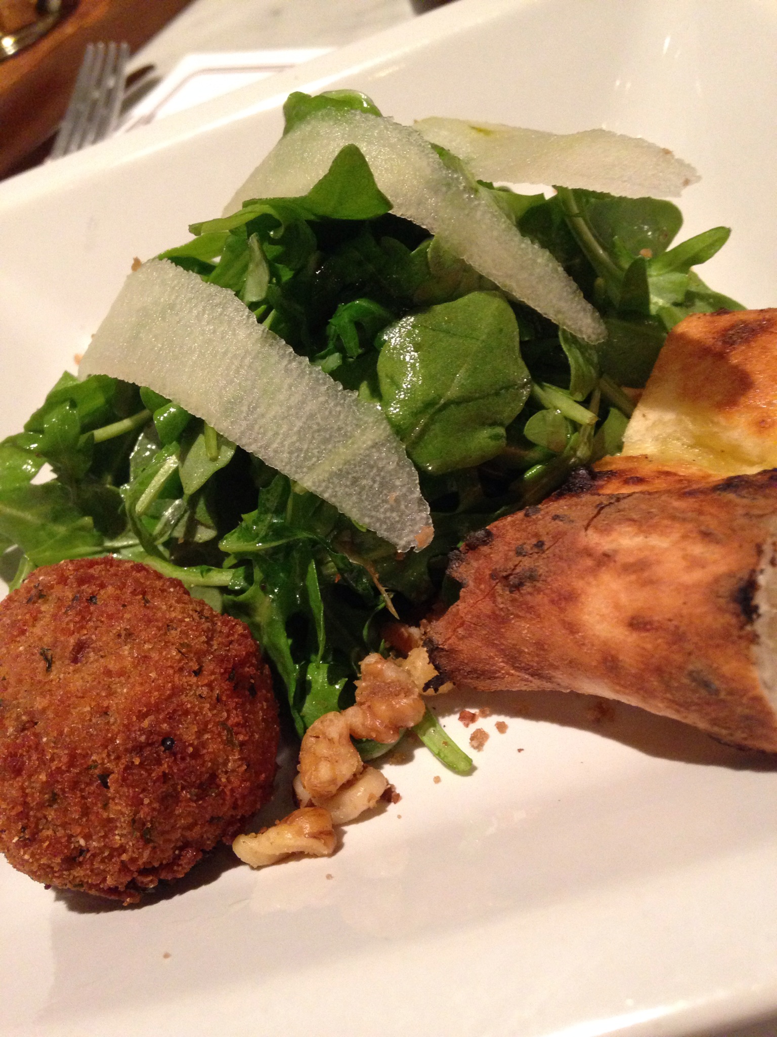 The Arugula Salad at Brick + Wood pairs argulua with shaved pears, candied walnuts, maple vingaigrette, and a fried bocconcini (or fried mozzarella ball). The maple vinaigrette adds a slight sweetness that the candied walnuts build upon making this a very interesting and tasty salad.