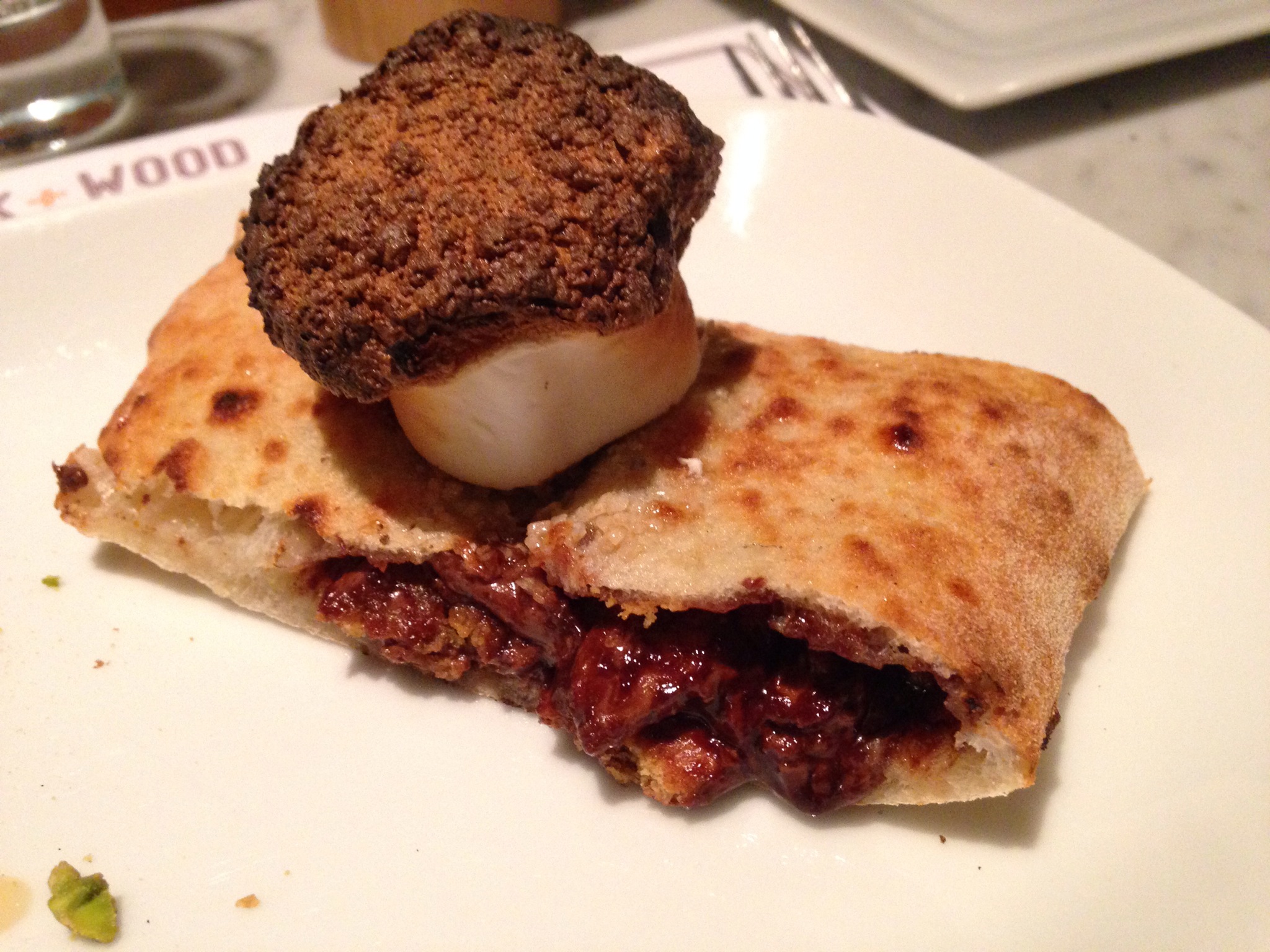 Take all the ingredients of a s’more but substitute the graham crackers with dough and bake it in a 900 degree oven and you have the S’mores Pizza at Brick + Wood. This seems like the perfect dessert for the family to share or anyone who feels like a s’more!