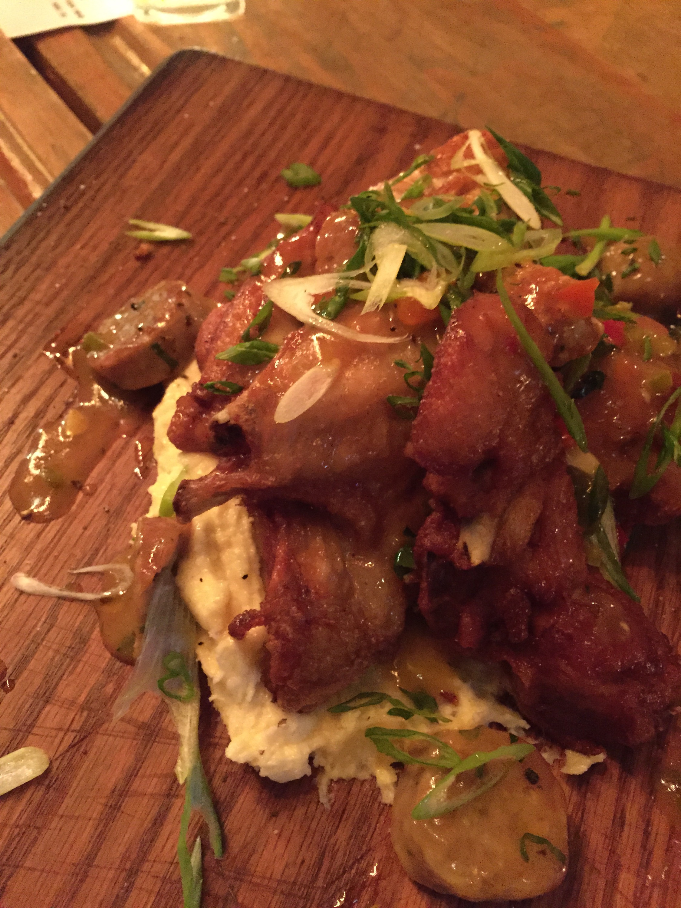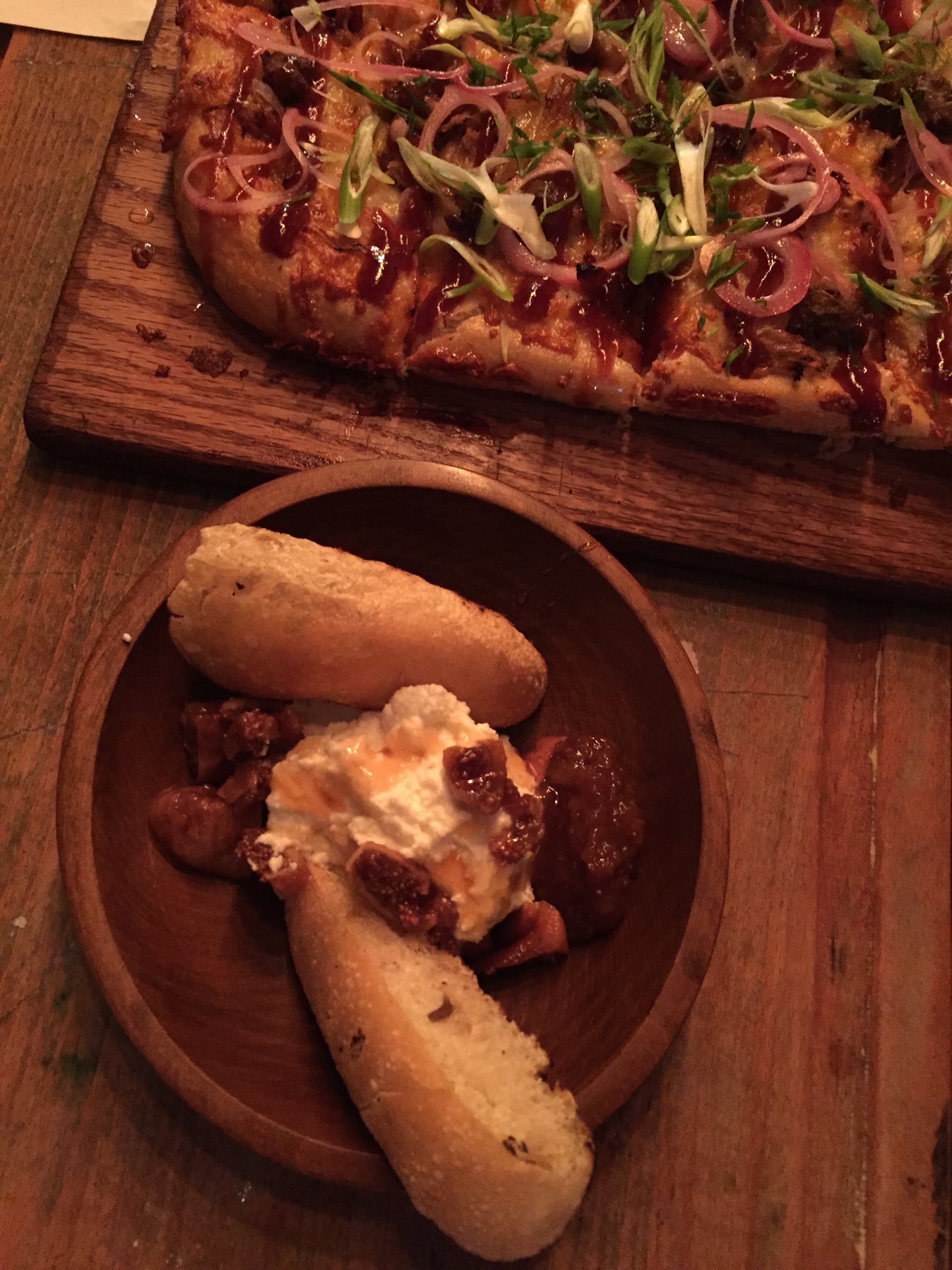 Whipped sheep’s milk ricotta, dried figs, honey comb, and charred fig jam comprise this small plate that I could not stop eating. The creaminess of the ricotta takes on the flavors of the sweet figs, honey and fig jam. This dish was delicious spread it on top of the crusty ciabatta it is served with or eaten by itself.