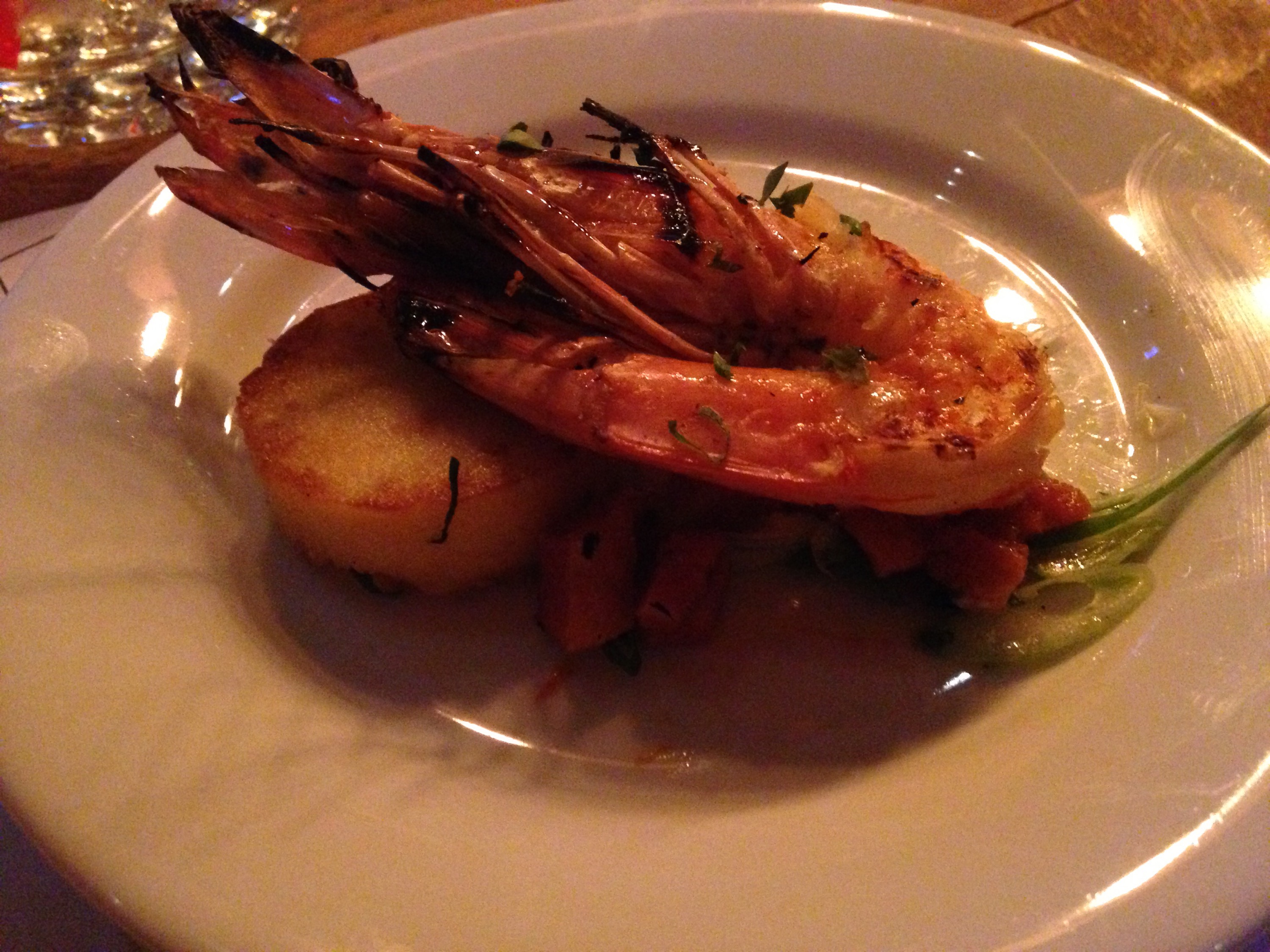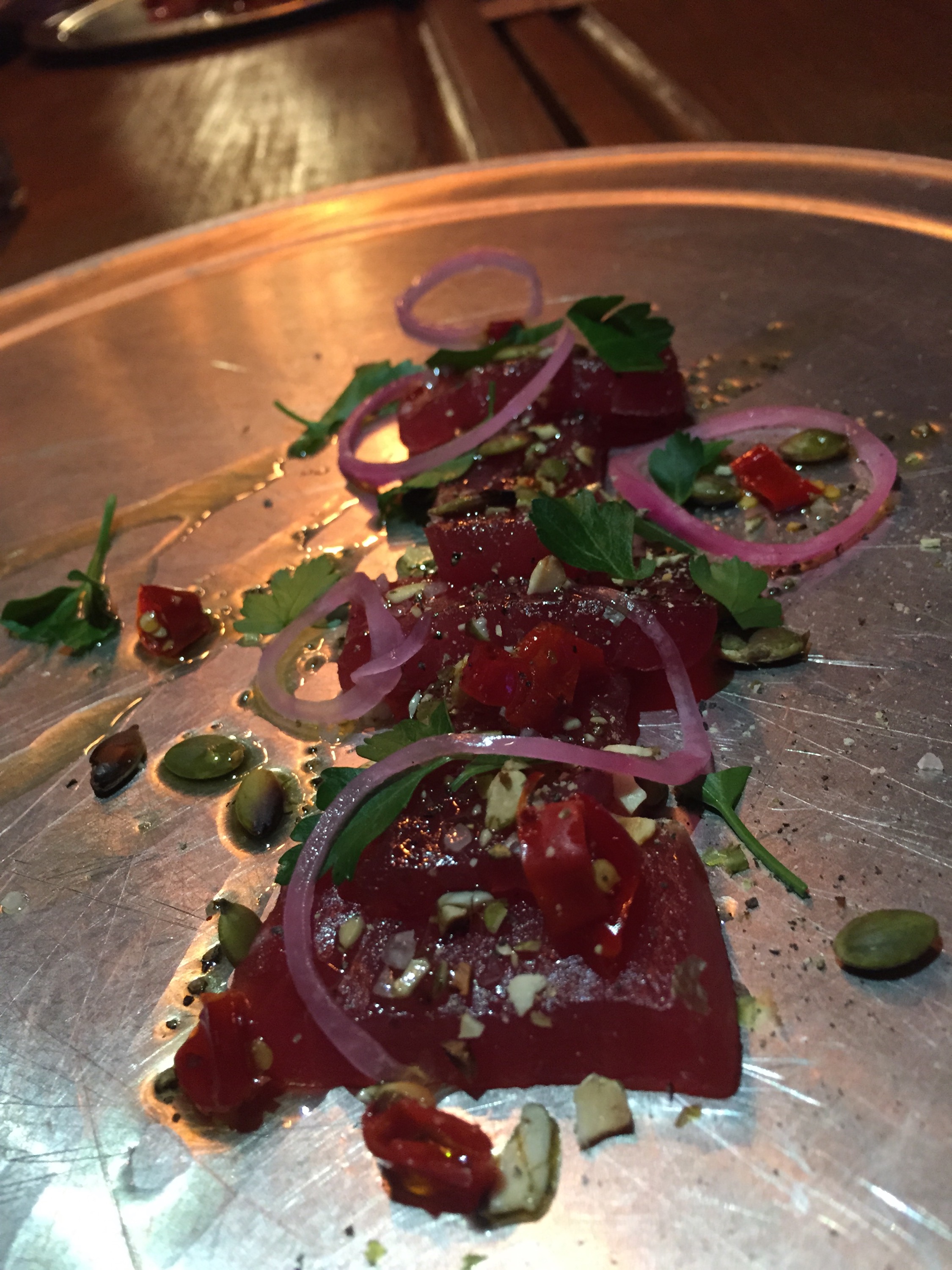 The seafood small plates continued with a Tuna Crudo made with Calabrian chiles, tasted pumpkin seeds, red onion, and torn parsley, and Shrimp and Polenta comprised of shrimp, tomato, house bacon, and polenta.