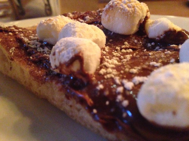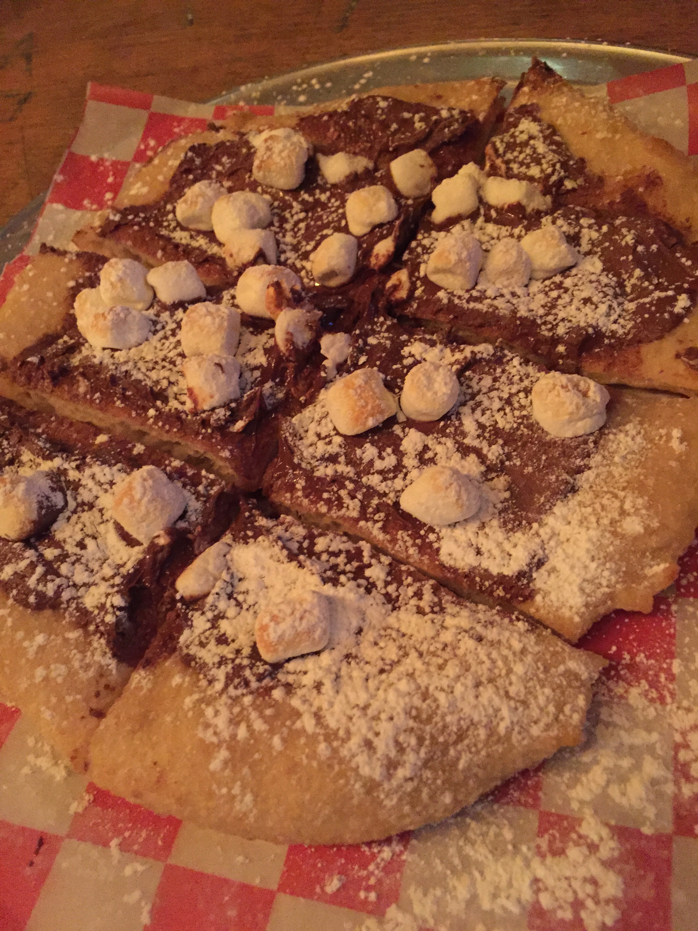 Nutella Pie is pizza dough baked and topped with nutella and marshmellows. If you have a sweet tooth this one is for you and the perfect dessert to share because it is a little larger than a small pizza!