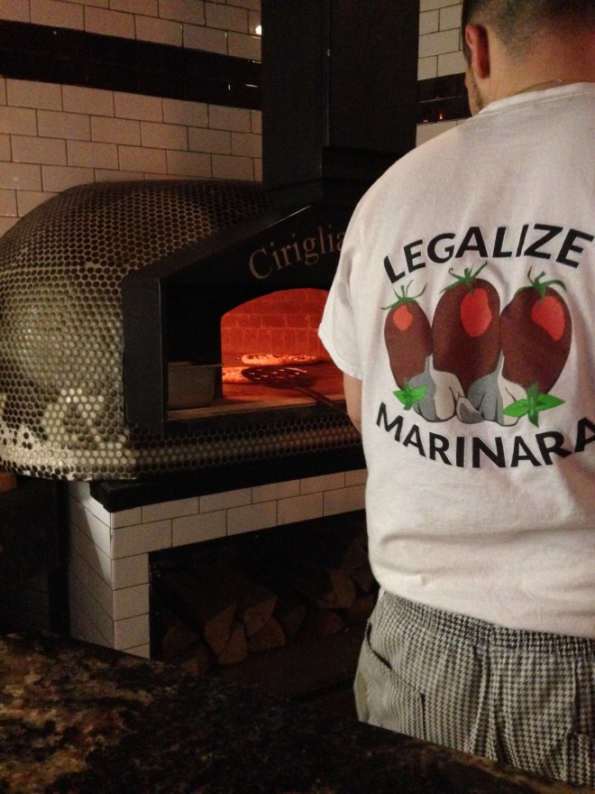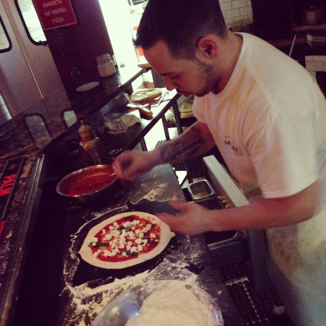 The round pies are Neapolitan style pizza certified by the Italian Associazone Pizzaiuoli Napoletani (APN). The APN, an association formed in Naples by pizza makers to preserve the authentic Neapolitan pizza values, requires a rigorous certification process for any restaurant wishing to serve authentic Neapolitan pizza and very few pizzaiolos in the United States are certified.