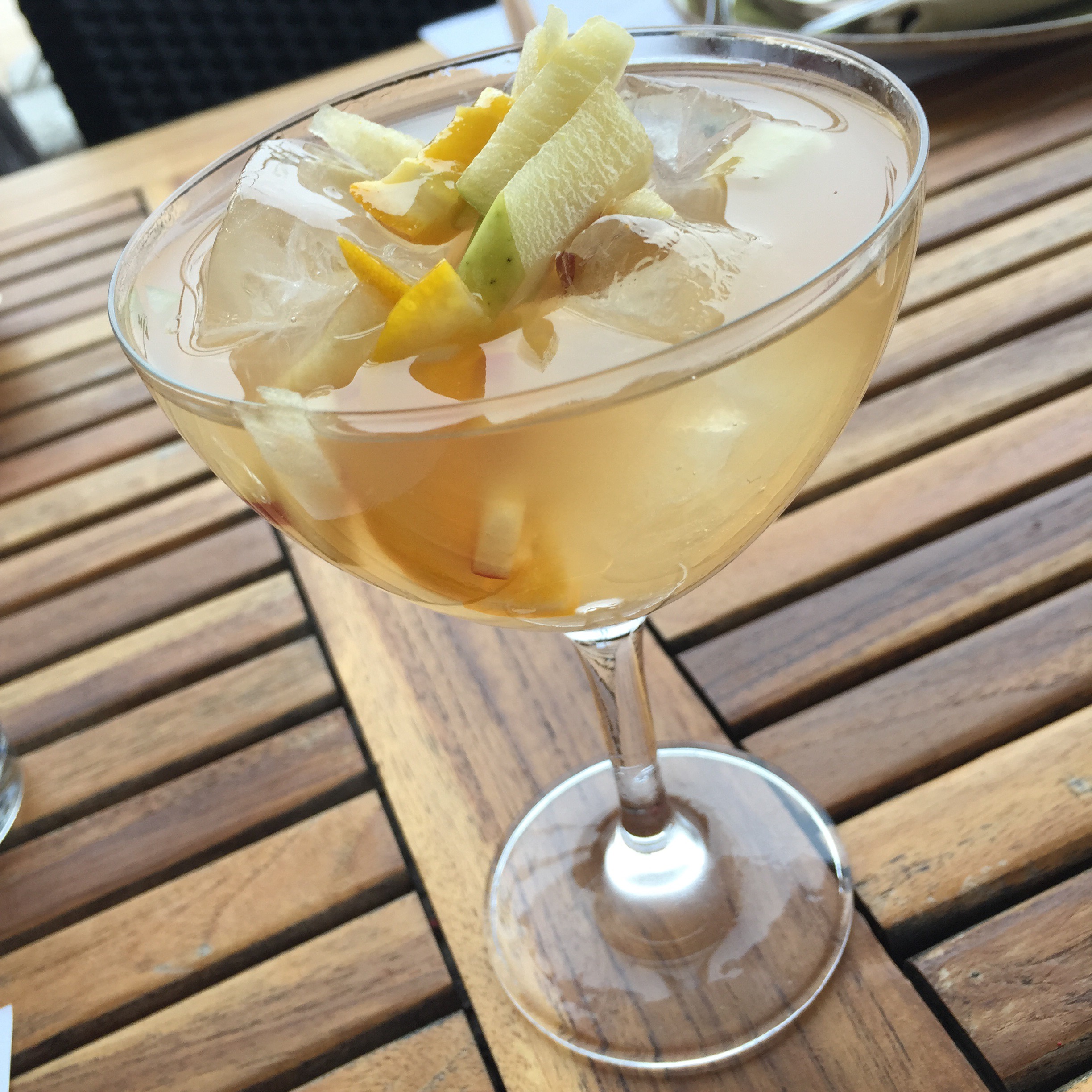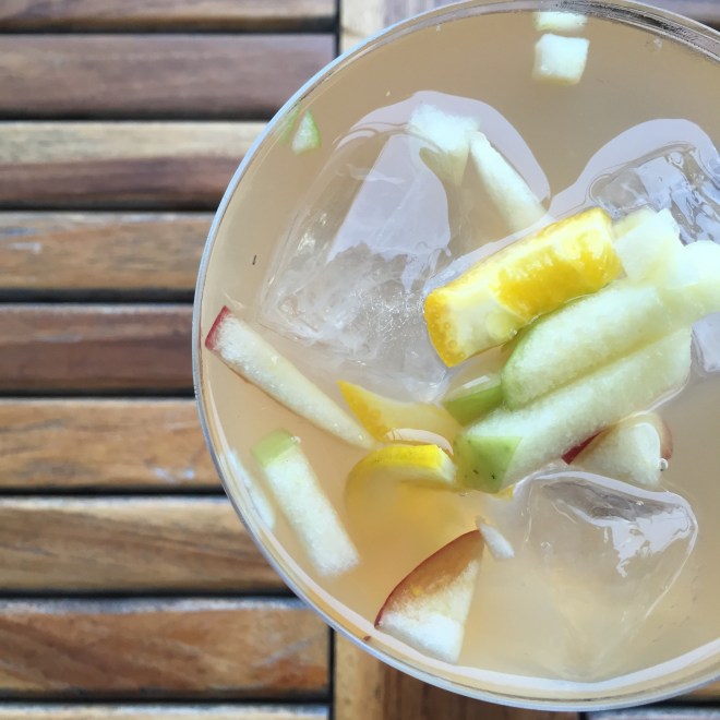 The “Bees and Bourbon” has hints of the sweet honey flavor and it compliments the bourbon making for a very smooth cocktail. Fans of Jack Daniels’ “Honey Jack” (or anything similar) will really enjoy this cocktail. The White Sangria, on the other hand was light and sweet from the very fresh-cut fruit; a perfect summer cocktail to enjoy on the patio.
