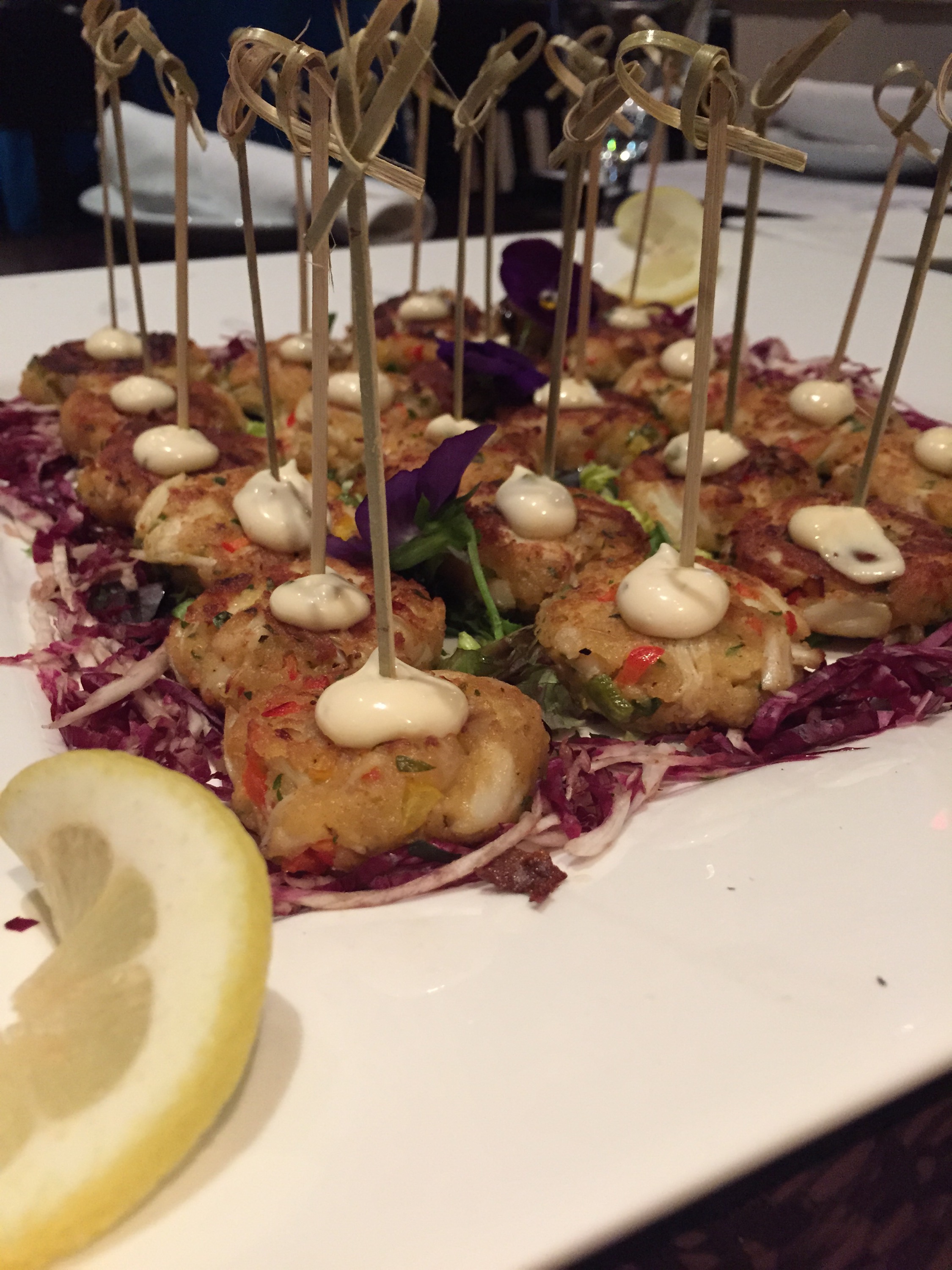 We began cocktail hour with hand passed fried oysters, mini crab cakes, and mixed berry sangria. The Fried Oysters are Bluepoint oysters coated in panko, fried, and served with a citrus wasabi aioli with grilled lemon. The panko is light and adds a little crunch to the chewy oysters while the wasabi adds the slightest kicks and pairs perfectly with the citrus. The Mini Crabcakes were packed with flavor from the crab meat itself to the finely diced red and green peppers inside to the spicy remalade sauce dolled on top.