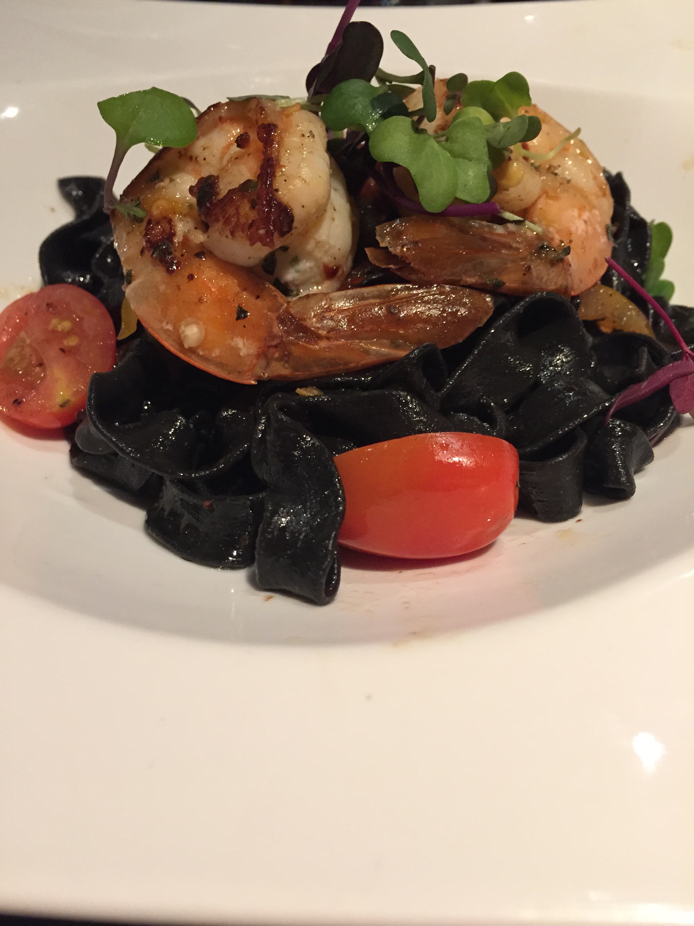 Topped with Andouille Sausage (not made in house), extra virgin olive oil, garlic, red pepper flakes, green bell peppers, and cherry tomatoes and paired with a Pinot Grigio/Sauvignon Blanc, Bertani “Due Uve,” the Spicy Squid Ink Fettuccine is excellent. You can expect a slight flavor from the squid ink, but mostly you will taste the shrimp and the spicy andouille sausage which has a nice kick to it!