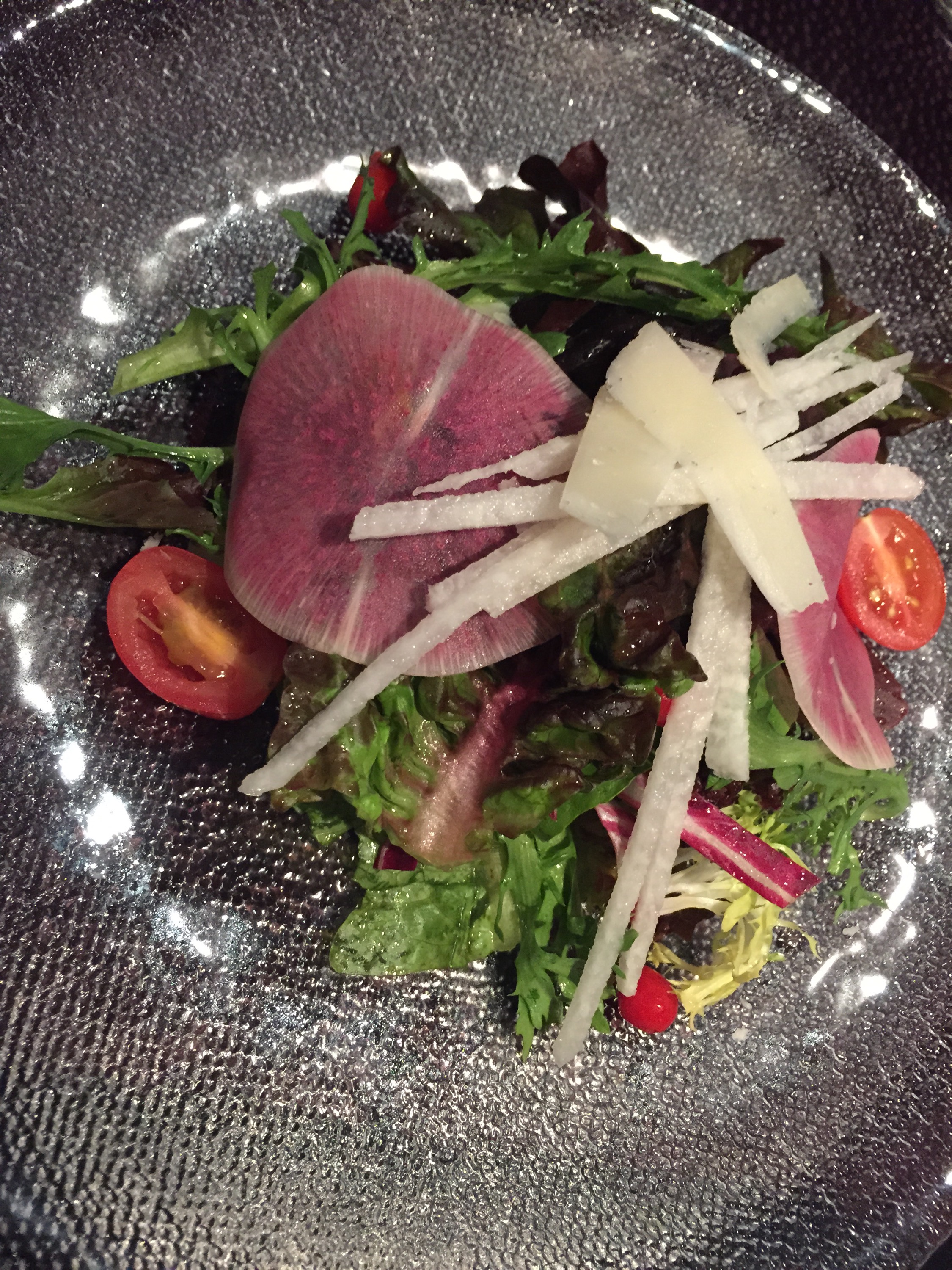 Organic mixed greens, watermelon radish, jicama, Peruvian sweet teardrop peppers (they look like small red berries), cherry tomatoes, shaved pecorino, drizzled with a balsamic vinaigrette comprise the Organic Mixed Green Salad at Rizzuto’s. What’s makes this salad stand apart from any other mixed green salad you might find? The unexpected ingredients you will not typically find in a mixed green salad such as the watermelon radish, jicama, and the beautiful and surprisingly sweet Peruvian teardrop pepper make this salad unique.
